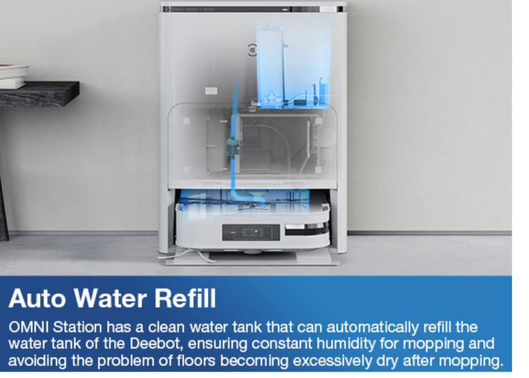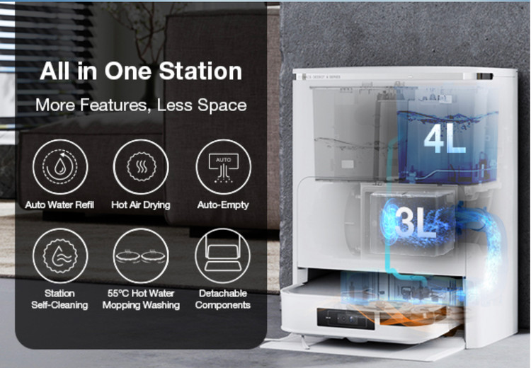 ایستگاه OMNI ALL-IN-1: ایستگاه OMNI یک راه حل تمیز کننده خودکار شامل تمیز کردن خودکار با شستشو با آبگرم در دمای 55 درجه سانتی گراد، تخلیه خودکار سطل گرد و غبار، خشک کردن خودکار هوای گرم، پر کردن خودکار آب وتعمیر و نگهداری خود ارائه می دهد. هر بار که شروع می کنید، ربات شما به خوبی جدید است. طراحی جمع و جور آن باخانه شما سازگار است