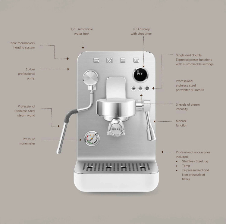 در این محصول، علاوه بر عملکرد اتوماتیک، منوی دستی نیز وجود دارد که به شما اجازه میدهد تا برای بهترین نتیجه در هر فنجان، تنظیمات دلخواه خود را اعمال کنید. بهعلاوه، گیج فشار سنج، صفحه نمایش بصری و اپلیکیشن اختصاصی My Smeg Assistant، همه به شما کمک میکنند تا به بهترین نتیجه ممکن برسید.