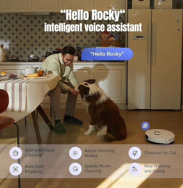 با گفتن عبارت “Hello Rocky”، میتوانید بدون نیاز به اتصال به اینترنت، دستورات مختلفی مانند شروع یا توقف نظافت، تنظیم حالتهای تمیزکاری و حتی شستشوی مخزن را صادر کنید.