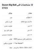 قدرت مکش Dyson Big Ball CY23 معادل ۲۵۰ وات هوا (Air Watt) است و با وجود وزنی حدود ۸ کیلوگرم، طراحی ارگونومیک آن باعث میشود حمل و جابهجاییاش بسیار راحت باشد. این مدل با ظرفیت مخزن ۱.۶ لیتر، طول کابل برق ۶.۴ متر و محدوده دسترسی ۱۰.۷ متر، امکان تمیزکاری گسترده بدون نیاز به تعویض پریز را فراهم میسازد. فیلتر آن مادامالعمر بوده و قابل شستشو است و نیازی به تعویض ندارد، که همین ویژگی در کنار فناوریهای انحصاری دایسون، نگهداری از دستگاه را بسیار ساده و اقتصادی میکند.